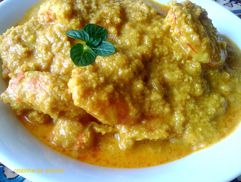 Com a varinha mágica triture o refogado e junte o caril, o açafrão, o louro, o coco ralado, o leite de coco e o sal.