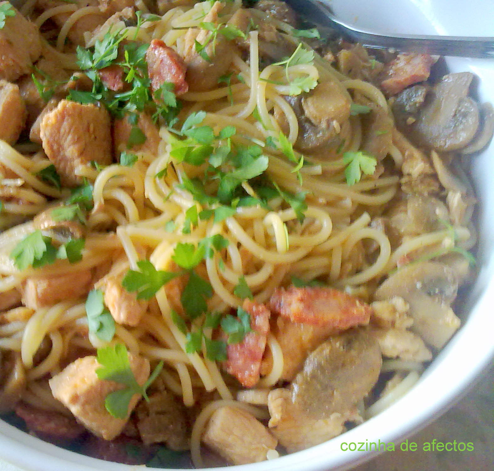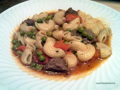 (Poderá cozer a massa no caldo da carne. Eu prefiro cozê-la sempre à parte, misturá-la e deixar apurar).